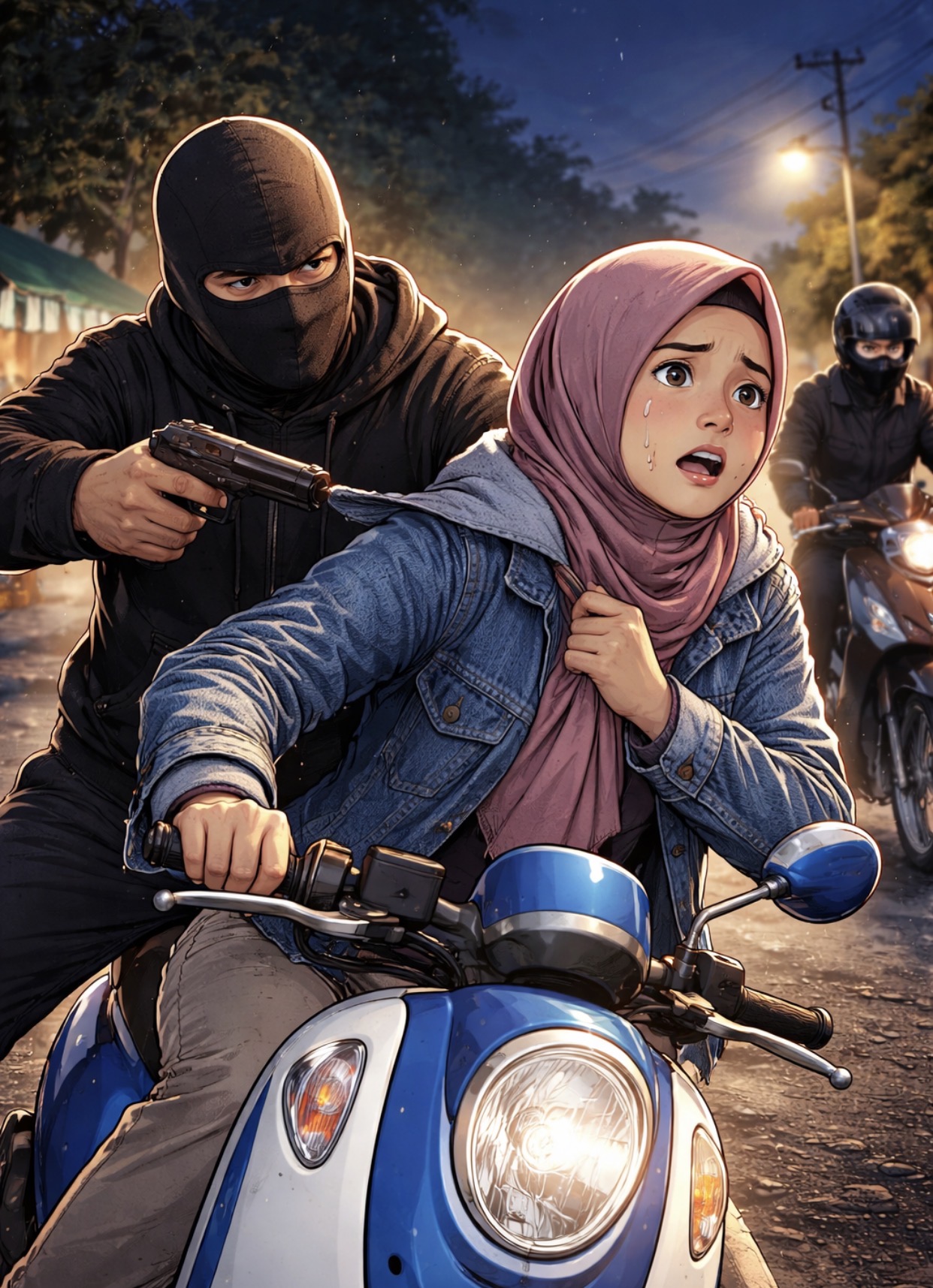 “Saya dipepet, sambil nangis panik saya coba lariin motor. Dia narik jaket saya dan nodongin pistol, entah itu asli atau tidak, saya takut karena pelakunya dua orang,” tuturnya.