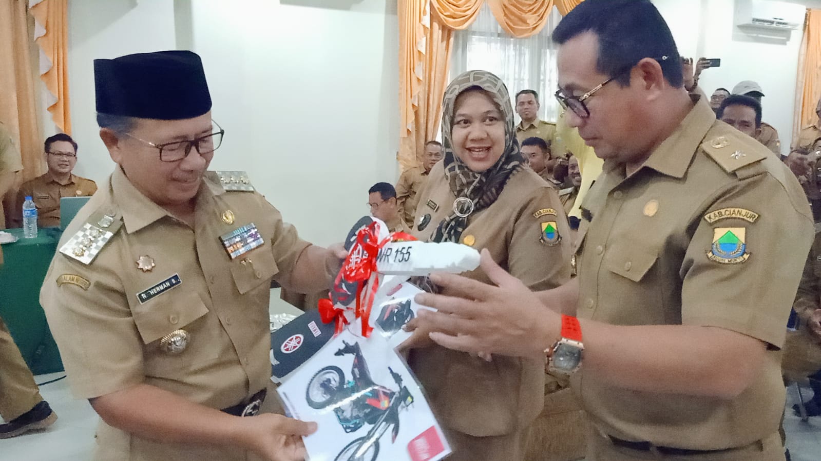 INFOCIRANJANG.COM, Cianjur – Sebanyak 354 Kepala Desa di Kabupaten Cianjur menerima bantuan sepeda motor dalam upaya mendukung kelancaran pelayanan kepada masyarakat. Penyerahan secara simbolis dilakukan oleh Bupati Cianjur, Herman Suherman, dalam acara pelatihan penyusunan kebijakan pengelolaan keuangan Desa se-Kabupaten Cianjur di Hotel Delaga Biru, pada Selasa (28/11/2023).