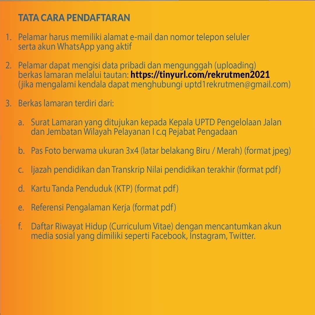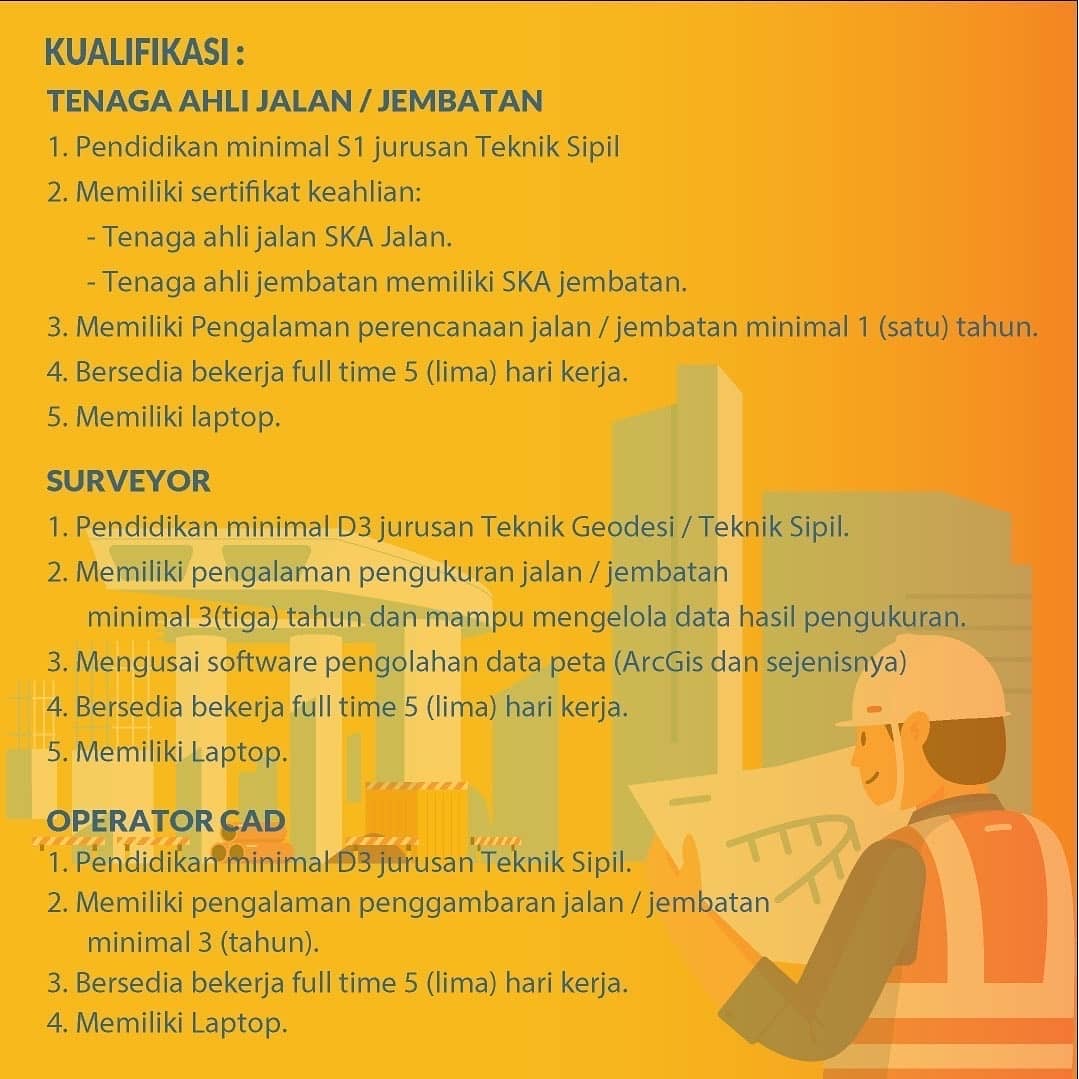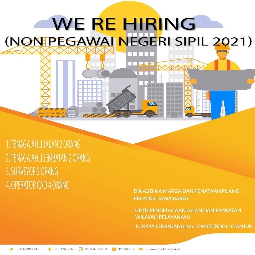 Saat ini dibutuhkan segera beberapa Tenaga Ahli dan Tenaga Teknis Non PNS TA 2021 yang akan bergabung dengan kami di UPTD Pengelolaan Jalan dan Jembatan Wilayah Pelayanan I.