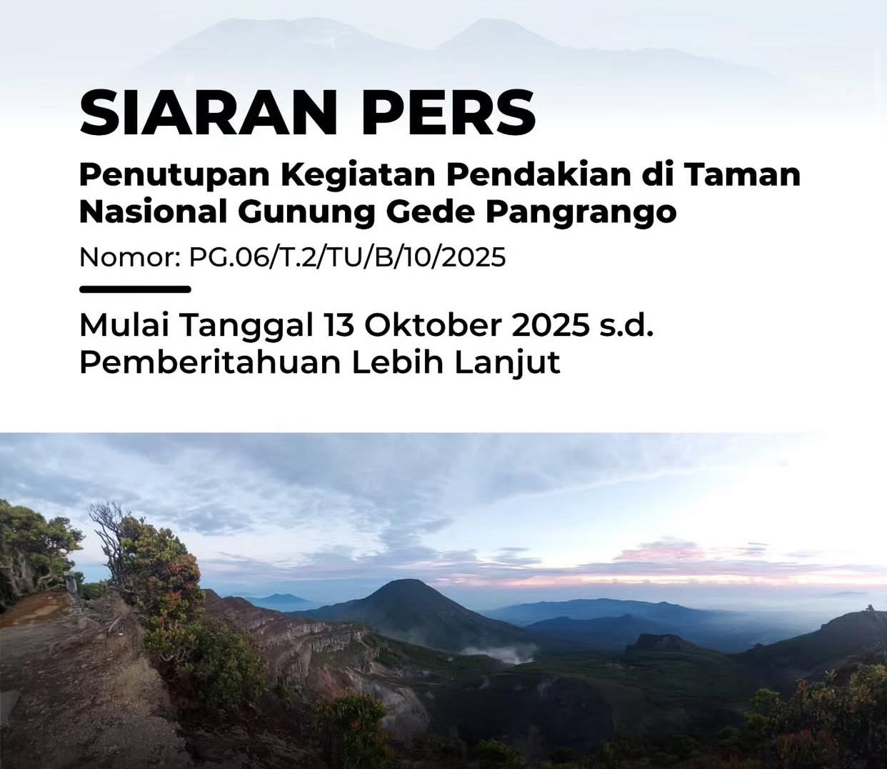 Kebijakan ini tertuang dalam Surat Edaran Nomor 374/2025 yang ditandatangani langsung oleh Kepala Balai Besar TNGGP, Arief Mahmud, pada 10 Oktober 2025.